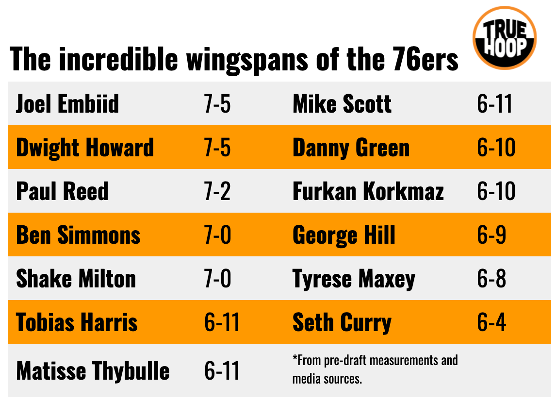 The 76ers’ starting five measures a combined 34 feet and six inches of wingspan—because Seth Curry drags the average way down with his 6-4 measurement. But look who’s about to check in: Matisse Thybulle (6-11 wingspan), Shake Milton (7-0), and Dwight Howard (7-5).