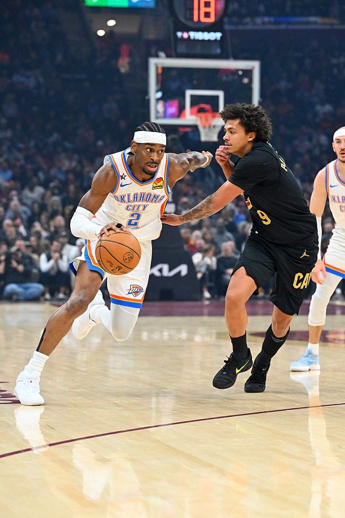 With no ball pressure from Allen and no help coming from Mitchell, SGA gets as easy a basket in the halfcourt as he will ever earn. Five steps in a straight line and no dribbles turning into two points. The Thunder lead, and as soon as SGA scored I looked to see if this was the kind of straight-line drive that would get Kenny Atkinson to call timeout.