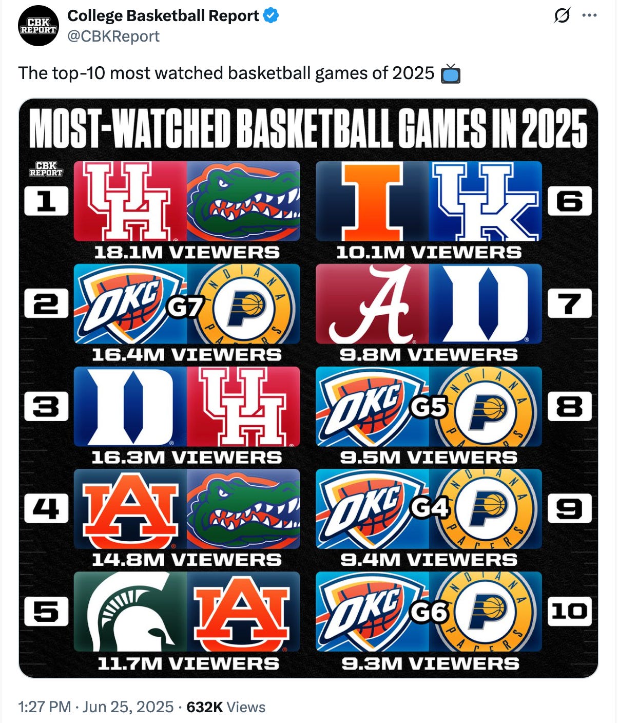 None of the 20 highest-paid players in the world made this list. Use social media metrics, off-court earnings, market-size, name recognition, or almost any other measure; the biggest names in the NBA didn’t appear in top-rated basketball games this year. Shai Gilgeous-Alexander is the MVP of everything, and becoming a household name, but still nowhere near the fame of LeBron James. The Pacers don’t have a single player in the NBA’s top 30 in scoring.