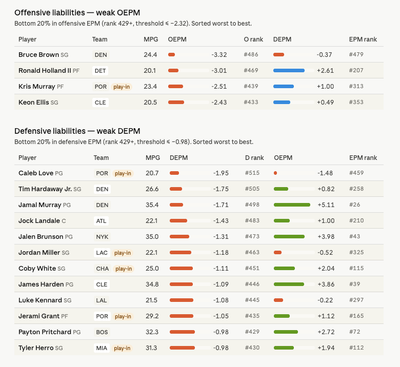 But first, wanted to share a little something I just made with help from Claude: these are players who are on teams that are in the postseason, averaged at least 20 minutes per game, and according to DunksandThrees, are pretty darned bad either on offense or defense.