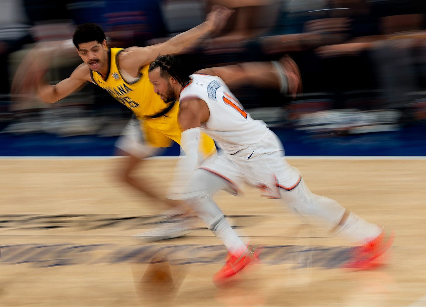 Now let’s consider Pacers’ benchwarmer Ben Sheppard. Sometimes he’d play in crunch time, more often he’d be resting down the row from Rick Carlisle. Sheppard makes roughly a quarter of an average NBA income. But when Donovan Mitchell and Jalen Brunson grabbed their knees from fatigue in the fourth quarter of playoff games, it was because they had been worn out by a whole relay team of Pacers. The Pacers throw many athletes at top opponents, it’s not a fair fight. While the super fresh Sheppard hassled Brunson in the photo above, Tyrese Haliburton, Andrew Nembhard, and Aaron Nesmith all rested and got ready to go even harder and faster when they next played Brunson. The deep-bench strategy doesn’t help the Pacers much in the first quarter before opponents get exhausted, but it pays off over time as circumstances deplete Brunsons. Sheppard deserves immense credit for helping to drain Brunson’s battery.